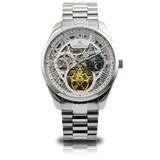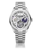 Experience the pinnacle of luxury watchmaking with the Villa Automatic mechanical Tourbillon inspired movement—a masterfully crafted timepiece that combines an exclusive tourbillon movement with an intricate open skeleton dial. Designed by Asorock Watches, this automatic tourbillon showcases its inner workings through a captivating see-through display, accentuating the complexity and precision of high-end watch craftsmanship with a working moonphase feature and dual time so you can tell time in two different time zones.