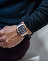 This stylish watch pays homage and gets design inspiration from the RM watch, with its tonneau barrel style silhouette making a strong impression with great wrist presence. Show off your style and confidence with this watch.